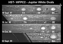 Процесс формирования трёх белых овальных штормов, позднее слившихся в Овал BA, можно отследить к 1939 году, когда в Южной умеренной зоне было три тёмных атмосферных структуры, которые фактически поделили зону на 3 длинных секции. Наблюдавший Юпитер Элмер Дж. Риз обозначил эти три тёмные секции как AB, CD, и EF. Секции ширились, сокращая между собой расстояние внутри STZ, и сформировались в белые овалы FA, BC, и DE[92]. Овалы BC и DE слились в 1998, сформировав Овал BE. Позднее, в марте 2000, BE и FA соединились и сформировали Овал BA[91].