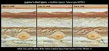 Большое красное пятно (БКП) — это устойчивый антициклонический шторм, расположенный на 22° южнее юпитерианского экватора, существующий уже по крайней мере 181 год, а, возможно, и дольше чем 346 лет[70][71]. Этот шторм был достаточно крупным, чтобы его можно было наблюдать в наземные телескопы.