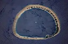 Ато́лл — коралловый остров либо архипелаг, имеющий вид сплошного или разорванного кольца, окружающего лагуну. Точнее, атолл представляет собой возвышение на дне океана, увенчанное коралловой надстройкой, образующей риф с группой островков-моту, разобщённых проливами. Эти проливы соединяют океан с лагуной. Если проливов нет, то суша образует сплошное кольцо, в этом случае вода в лагуне может быть менее солёной, чем в океане. Возвышение на дне океана обычно имеет форму конуса, образованного потухшим вулканом.