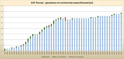 От СССР Российской Федерации досталось 28 энергоблоков на 10 АЭС общей номинальной мощностью 20 242 МВт (без учёта реакторов, для которых выработка электроэнергии была побочной задачей, например экспериментальной Обнинской АЭС и промышленной Сибирской АЭС).
