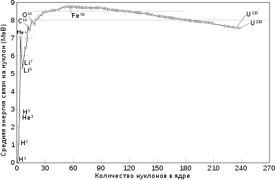 Другим важным параметром ядра является энергия связи, приходящаяся на один нуклон ядра, которую можно вычислить, разделив энергию связи ядра на число содержащихся в нём нуклонов: