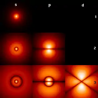 Изображение справа показывает первые несколько орбиталей атома водорода (собственные функции гамильтониана). Они представляют собой поперечные сечения плотности вероятности, величина которой отражена цветом (чёрный цвет соответствует минимальной плотности вероятности а белый — максимальной). Квантовое число углового момента l обозначено в каждой колонке, используя обычные спектроскопические обозначения (s означает l = 0; p: l = 1; d: l = 2). Главное квантовое число n (= 1, 2, 3…) отмечено справа от каждого ряда. Для всех картин магнитное квантовое число m равно 0, и сечение взято в плоскости — XZ, Z — вертикальная ось. Плотность вероятности в трёхмерном пространстве получается при вращении картинки вокруг оси Z.