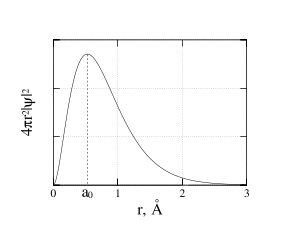 Радиальная зависимость dp(r)/dr плотности вероятности нахождения электрона в атоме водорода, находящемся в основном состоянии, представлена на рисунке. Эта зависимость даёт вероятность того, что электрон будет обнаружен в тонком шаровом слое радиуса r толщиной dr с центром в ядре. Площадь этого слоя равна S = 4πr2, его объём dV = 4πr2dr. Общая вероятность нахождения электрона в слое равна (4πr2dr) ψ2, поскольку в основном состоянии волновая функция электрона сферически симметрична (то есть постоянна в рассматриваемом шаровом слое). Рисунок выражает зависимость dp(r)/dr = 4πr2ψ2. Кривая радиального распределения плотности вероятности dp(r)/dr нахождения электрона в атоме водорода имеет максимум при a0. Этот наиболее вероятный радиус совпадает с боровским радиусом. Размытое облако плотности вероятности, полученное при квантовомеханическом рассмотрении, значительно отличается от результатов теории Бора и согласуется с принципом неопределённости Гейзенберга. Это размытое сферически симметричное распределение плотности вероятности нахождения электрона, называемое электронной оболочкой, экранирует ядро и делает физическую систему протон-электрон электронейтральной и сферически симметричной — у атома водорода в основном состоянии отсутствуют электрический и магнитный дипольные моменты (как и моменты более высоких порядков), если пренебречь спинами электрона и ядра. Максимум объёмной плотности вероятности ψ2 достигается не при r = a0, как для радиальной зависимости, а при r = 0.