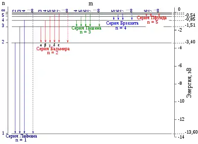 Схема образования спектра атомарного водорода и спектральные серии представлена на рисунке[3].