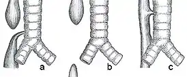 - верхний отрезок пищевода оканчивается слепо, нижний соединен свищевым ходом с трахеей выше её бифуркации.