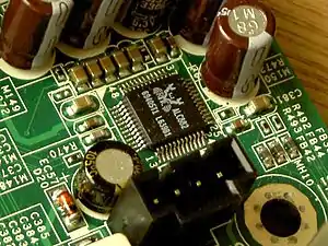 Аудиокодек на аппаратном уровне обозначает отдельную микросхему, которая кодирует и декодирует аналоговый звуковой сигнал в цифровой сигнал и наоборот при помощи аналогово-цифрового и цифро-аналогового преобразователей. Цифро-аналоговая конвертация происходит, когда компьютер посылает звук на внешние динамики, а аналого-цифровая конвертация происходит, когда звук подаётся на компьютер извне.[1][2]