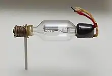 С середины 19-го века было известно, что горящий газ обладает электропроводностью, и ранние экспериментаторы по беспроводной связи заметили, что на эту проводимость влияет присутствие радиоволн. Де Форест обнаружил, что газ в частичном вакууме, нагретый обычной лампой накаливания, ведет себя примерно так же, и что если бы провод был обернут вокруг стеклянного корпуса, устройство могло бы служить детектором радиосигналов. В его оригинальной конструкции маленькая металлическая пластина была запечатана в корпус лампы, которая была соединена с положительным выводом 22-вольтовой батареи через пару наушников, отрицательный вывод был подключен к одной стороне нити накала лампы. Когда беспроводные сигналы подавались на провод, обернутый вокруг внешней стороны стекла, они вызывали возмущения в токе, который производил звуки в наушниках.