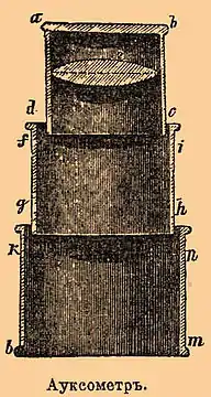Первая трубка abcd свободно скользит в последующей и имеет в некотором расстоянии от окуляра двояковыпуклую чечевицу е; вторая трубка fghi, скользящая в свою очередь в третьей, снабжена на оконечности прозрачной роговой пластинкой, на которой нанесены деления в 1/30 мм расстояния друг от друга; наконец, третья трубка, открытая с обоих концов, klmn, служит для того, чтобы роговая пластинка gh могла быть помещена так, что изображение наблюдаемого тела ясно воспринимается за объективом астрономической трубы. При употреблении А-а направляют исследуемую трубу на какой-либо предмет, отчётливо через неё видимый; затем выдвигают трубку abcd настолько, что через чечевицу е ясно видны деления пластинки gh; поместив далее ауксометр на трубу, приноравливают постепенным выдвиганием трубку klmn так, что изображение предмета отпечатлевается на пластинке gh, рассматривая его через чечевицу е. На пластинке gh отсчитывается число делений, охватываемых диаметром изображения; циркулем или микрометром измеряют диаметр отверстия объектива в сотых долях дюйма и делят последнее число на количество сотых долей, охватываемых на пластинке изображением объектива в диаметре; полученное частное дает размер увеличения данной трубы. В основании А-а лежит тот принцип, что линейное увеличение астрономической трубы равно частному от деления величины фокусного расстояния объектива на величину фокусного расстояния окуляра. Последнее же частное, или отношение двух фокусных расстояний, пропорционально отношению диаметра отверстия объектива к диаметру изображения, воспринимаемого в отверстии окуляра от отверстия объектива, что прямо прилагается в ауксометр.