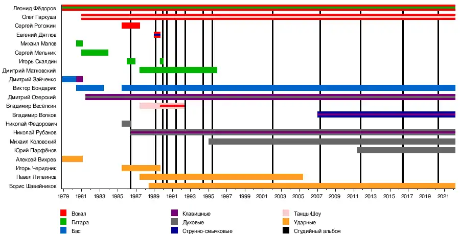 - Леонид Фёдоров — вокал, электрогитара, акустическая гитара, перкуссия (1978—наши дни)