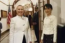 В ноябре 2011 на встрече лидеров «Национальной лиги за демократию» было решено участвовать в довыборах в парламент[36]. После этого решения Аун Сан Су Чжи участвовала в телефонной конференции с Президентом Соединённых Штатов Америки Бараком Обамой. Политики договорились, что Госсекретарь США Хиллари Клинтон прибудет в Мьянму. 1 декабря 2011 Су Чжи встретилась с Хиллари Клинтон в резиденции американских дипломатов в Янгоне[37]. А 21 декабря 2011 года премьер-министр Таиланда Йинглак Чиннават посетила Су Чжи, и это стало первой встречей мьянмарского оппозиционера с первыми лицами зарубежных стран[38].