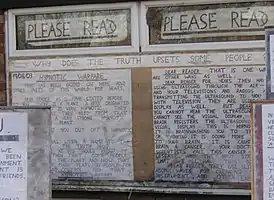 ![]() Сообщения, покрывающие окна дома человека с шизофренией. На рисунке выше показан случай шизофренического аутизма. Пациент живёт в своем собственном мире, с фантазиями о передаваемом ультразвуке и гипнотической войне, полностью игнорируя уверения в абсурдности этих идей. |