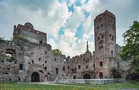 | Средневековая крепость Ауэршперг близ Кочевья | Руины замка герцогов Мюнстербергских, Польша | Барочный дворец Ауэршпергов в Вене (1706-10) |