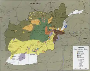 Афганская война (1979—1989) (пушту په افغانستان کې شوروی جګړه, перс. جنگ شوروی در افغانستان — Советская война в Афганистане); также в современной историографии встречается определение Афганский конфликт 1979—1989[39], — военный конфликт на территории Демократической Республики Афганистан (Республика Афганистан с 1987 года) между правительственными силами Афганистана при поддержке Ограниченного контингента советских войск с одной стороны и вооружёнными формированиями афганских моджахедов («душманов»), пользующихся политической, финансовой, материальной и военной поддержкой ведущих государств НАТО, Китая и консервативного исламского мира, с другой стороны[10][11][12][15][40][41][42][43]. В обиходе Афганскую войну принято называть кратко — Афган[44].