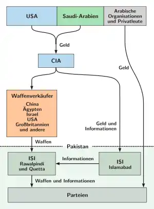 Под наблюдением ЦРУ поставлялось оружие для антиправительственных вооружённых формирований. На территории Пакистана в лагерях афганских беженцев были развёрнуты центры специальной подготовки вооружённых группировок. Главным образом программа основывалась на использовании пакистанской разведки (ISI) в качестве посредника для распределения финансирования, снабжения оружием и обучения афганских сил сопротивления[58].