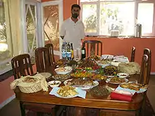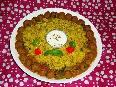 Всю еду подают одновременно; употребляют сперва мясные блюда, затем десерты[6]. После трапезы подают сперва фрукты, а затем несладкий чай с кардамоном[6].