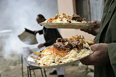 По традиции в Афганистане едят, сидя на полу на подушках, и большими группами. На 3—4 человек ставят большое блюдо с рисом, окружённое сосудами поменьше с кормой, кебабами и овощными блюдами[5]. Пищу берут правой рукой; рис при этом скатывают в комочки и затем отправляют в рот[6].