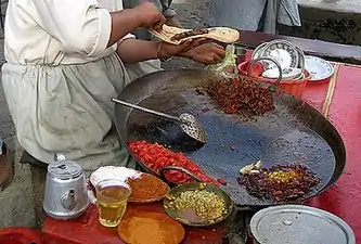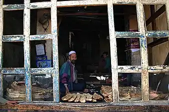 Хлеб с чаем (в богатых семьях — также сыром, каймаком, мёдом и вареньем) — обычный завтрак для афганцев[5]. С помощью хлеба едят не только твёрдую пищу, но и суп — окуная лепёшку в него[6]. Бедняцкий обед часто состоит из бульона и лепёшки[5]. В сезон с хлебом употребляют виноград; ещё одно традиционное блюдо с хлебом — каймак, варёный с чесноком, солью и перцем, который кладут на хлеб[5].