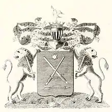 Щит увенчан дворянским шлемом с дворянскою на нём короною, из коей виден выходящий лев натурального цвета, держащий в правой лапе меч. Намет на щите золотой, подложенный с правой стороны голубым, а с левой красным[8].