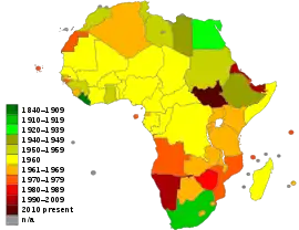Процесс колонизации приобрёл широкие масштабы во второй половине XIX века, особенно после 1885 с началом так называемой гонки или драки за Африку. Практически весь континент (кроме остававшихся независимыми Эфиопии и Либерии) к 1900 был разделён между рядом европейских государств: Великобританией, Францией, Германией, Бельгией, Италией, свои старые колонии сохранили и несколько расширили Испания и Португалия.