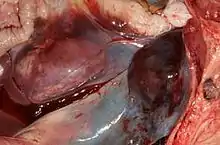Обнаруживают многочисленные кровоизлияния в кожу, слизистые и серозные оболочки. Лимфатические узлы (особенно желудочные, печеночные, брыжеечные, почечные) увеличены в 2-4 раза, мягкие, снаружи и на разрезе темно красного цвета, иногда поверхность разреза имеет мраморный рисунок. В грудной и брюшной полостях — желтоватый серозно-геморрагический экссудат с примесью фибрина, иногда крови. Внутренние органы, особенно селезёнка, увеличены, с множественными кровоизлияниями. В лёгких — междольковый отёк. Для гистологической картины характерны сильный распад хроматина ядер лимфоцитов в тканях РЭС, кариорексис в печени.