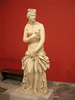 Статуя изображает молодую почти обнаженную женщину. Из одежды на ней — лишь гиматий (или пеплос), обёрнутый вокруг бёдер. Одежда широко спадает вниз по бокам и сзади, обнажая верх бёдер и ягодиц. Соединённые с постаментом, нисходящие складки гиматия выполняют функцию дополнительной опоры статуи, поскольку ноги, поставленные очень близко друг к другу, не могут обеспечить должной устойчивости. Голова богини повёрнута налево, она опирается на левую ногу, правой рукой прикрывает левую грудь. Такой тип принято называть Venus pudica (Венера Стыдливая) — самым известным примером является «Афродита Книдская»[2].