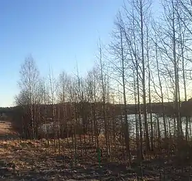 ![]() Вид на озеро Ахвенъярви со стороны посёлка Реускула весной 2020 года | |
