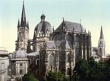 В конце XIX века из 27 церквей, находящихся в городе, наиболее примечателен Ахенский собор. Ядром его служит императорская капелла (Pfalzkapelle), построенная около 796 года по инициативе Карла Великого Одоном Мецским в византийском стиле и освящённая в 804 году папой Львом III. Капелла упоминается во французском названии Ахена — Aix-la-Chapelle (Экс-ля-Шапель), где Aix происходит от лат. aqua / древнегерм. ahha — «вода», и фр. chapelle — «капелла». В монастыре Аахенского собора находится знаменитая Сокровищница.