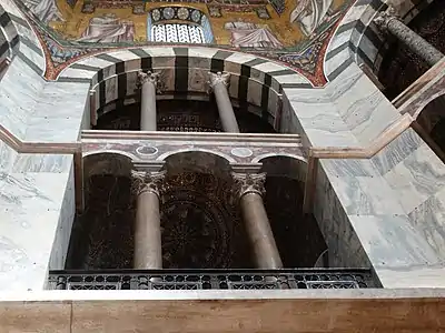 В середине его лежит камень с надписью «Carolo Magno». Однако, не под ним находится гроб Карла Великого, который в 1000 году был вскрыт по велению императора Оттона III. По словам летописи монастыря Новалезе, составленной в 1048 году, император был найден прекрасно сохранившимся, в белом императорском облачении, сидящим в кресле с короной на голове и скипетром в руках. В 1165 году при канонизации Карла Великого император Фридрих I Барбаросса велел снова вскрыть императорскую могилу. По всей вероятности, он велел переложить останки императора в показываемый богато украшенный ящик, из которого император Фридрих II в 1215 году переложил их опять в другой драгоценный гроб художественной работы. В этом последнем гробу, стоявшем на алтаре хора, останки императора покоились до конца XVIII века, после чего были перенесены в ризницу[2]. Найденные в гробу знаки императорского достоинства были перенесены в 1798 году в Вену. Белый мраморный стул, на котором будто бы император был найден сидящим, позже был обложен золотом и до 1531 года служил троном императору, когда он после коронования приветствовал имперских князей. Теперь он стоит на вершине восьмиугольника.