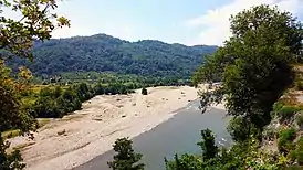 ![]() Вид на Ахинтам с правого берега Шахе | |