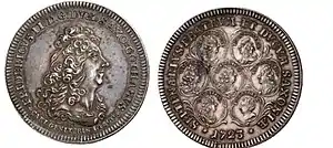 Круговая надпись на аверсе «FRIDERICVS II . D. G. DVX. SAXO=GOTHANVS» обозначает «Фридрих II, Божьей милостью правитель Саксен-Готы». Под портретом герцога расположены слова «CARI GENITORIS IMAGO», что в вольном переводе с латыни звучит как «Дорогие родителю лица»[2]. Непосредственно под портретом находится небольшая буква «K.». Она обозначает знак медальерного мастера Иоганна Кристиана Коха[2][3].