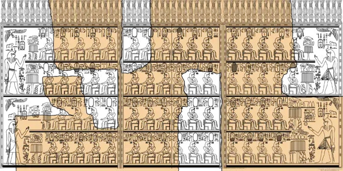 В стороне от главного зала расположено помещение, рельефы на стенах которого изображают юбилейные приношения Тутмоса своим 61 предкам. В мае 1843 года французский археолог Эмиль Присс тайно демонтировал эти барельефы («Карнакский царский список») и вывез их в Лувр. Из-за неверного нанесения лака из битума цветная роспись барельефов утрачена.