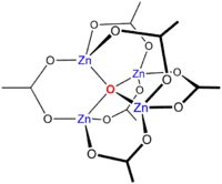 Нагрев Zn(CH3CO2)2 в вакууме даёт потерю уксусного ангидрида, оставляя осадок основного ацетата цинка с формулой Zn4O(CH3CO2)6. Этот кластер имеет тетраэдрическую структуру.