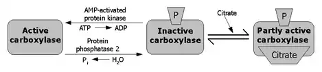 Фосфорилирование может происходить, когда гормоны глюкагон или адреналин связываются с рецепторами клеточной поверхности, но основная причина фосфорилирования связана с повышением уровня АМФ при низком энергетическом статусе клетки, что приводит к активации АМФ-активируемой протеинкиназы. (AMPK). AMPK является основным регулятором киназы ACC, способным фосфорилировать ряд сериновых остатков на обеих изоформах ACC[18]. На ACC1 AMPK фосфорилирует Ser79, Ser1200 и Ser1215. Протеинкиназа А также обладает способностью фосфорилировать АСС с гораздо большей способностью фосфорилировать АСС2, чем АСС1. Однако физиологическое значение протеинкиназы A в регуляции ACC в настоящее время неизвестно. Исследователи предполагают, что существуют другие киназы ACC, важные для его регуляции, поскольку существует множество других возможных сайтов фосфорилирования на ACC[19].