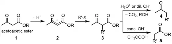 Алкилирование натрийацетоуксусного эфира 2 с последующим кетонным либо кислотным расщеплением моно- и дизамещенных ацетоуксусныых эфиров 3 используется как препаративный метод синтеза метилкетонов 4 и замещенных уксусных кислот 5: