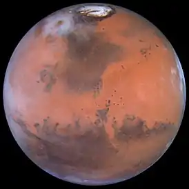 ![]() Ацидалийская равнина (точнее, Ацидалийское море) — тёмная область сверху. Снимок «Хаббла», 1999 | |