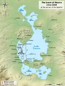 Итак, в 1256 году мешика остановились на скале, омываемой родником и окружённой зарослями ауэуете. Это был Чапультепек, тогда — лес. Перед ними простиралось озеро Тескоко. К приходу мешика земли вокруг озера Тескоко давно были поделены между прибрежными городами-государствами. Признав верховную власть правителя города Аскапоцалько, мешика обосновались на двух небольших островах и построили Тлателолько (Тлальтелолько). Теночтитлан (город Теноча) был основан в 1325 г. Со временем он стал большим искусственным островом, теперь это место — центр города Мехико. Согласно легенде, когда ацтеки прибыли в долину Анауак, местное население считало их самой нецивилизованной группой, но мешика решили учиться; и они взяли все знания, какие только могли, от других народов, — большей частью от древних тольтеков (которых они могли путать с более древней цивилизацией Теотиуакана). Для мешика тольтеки были создателями всей культуры, слово «тольтекайотль» было синонимом культуры. Легенды мешика отождествляют тольтеков и культ Кетцалькоатля с мифическим городом Толлан (современная Тула, штат Идальго, Мексика), который они также отождествляли с более древними теотиуаканами[22]. Год основания Теночтитлана датируется, как правило, 1325 годом. В 1376 году была основана королевская династия мешика, когда Акамапичтли, сын отца-мешика и колуаканской матери, был избран первым тлатоани города Теночтитлан[23].