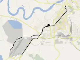 Две трамвайные линии охватывают комплекс глинозёмного комбината с двух сторон. Маршрут 1 обслуживает основные проходные АГК. Маршрут 2 ответвляется на запад, к вспомогательным промышленным объектам на задворках комбината.