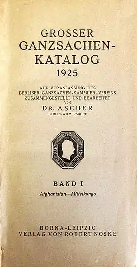 - Dr. Aschers Großer Ganzsachen-Katalog 1928 // Die Ganzsache[≡]. — 1929. — 9. Jahrgang. — Nr. 2. (нем.) [Цитата из послесловия к каталогу: «5 августа 1923 года появилась первая часть этого каталога, в январе 1929 года — последняя на сегодня часть. И если добавить каталог 1913—1920 годов, позади лежит восемь лет каталожной работы».]