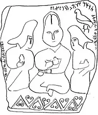 Первым иконографическим подтверждением связи легендарной генеалогии тюркских каганов с праматерью-волчицей и прародителем человеком стал древнейший памятник тюрков — согдоязычная Бугутская стела (580—587), где впервые упомянуто имя царского рода тюрков — Ашина[23]. Бугутская надпись открывается словами: «Эту стелу установили тюркские цари из племени Ашина...». В дальнейшем тексте, упоминаются имена тюркских государей — Буман-кагана, Муган-кагана, Таспар-кагана и Нивар-кагана[24].