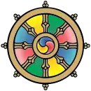 Дхармачакра, или «Колесо учения» или «Колесо закона» символизирует Гаутаму Будду и учение Дхармы. Этот символ обычно используется тибетскими буддистами, где он также иногда вбирает в себя Колесо Радости Gankyil. Непальские буддисты не включают Колесо учения в число восьми благоприятных символов.