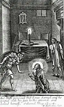 И сказал ей [Саул]: прошу тебя, поворожи мне и выведи мне, о ком я скажу тебе. Но женщина отвечала ему: ты знаешь, что сделал Саул, как выгнал он из страны волшебников и гадателей; для чего же ты расставляешь сеть душе моей на погибель мне? И поклялся ей Саул Господом, говоря: жив Господь! не будет тебе беды за это дело. Тогда женщина спросила: кого же вывесть тебе? И отвечал он: Самуила выведи мне. И увидела женщина Самуила и громко вскрикнула; и обратилась женщина к Саулу, говоря: зачем ты обманул меня? ты — Саул. И сказал ей царь: не бойся; что ты видишь? И отвечала женщина: вижу как бы бога, выходящего из земли. Какой он видом? — спросил у неё [Саул]. Она сказала: выходит из земли муж престарелый, одетый в длинную одежду. Тогда узнал Саул, что это Самуил, и пал лицем на землю и поклонился.
