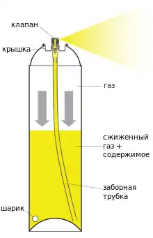 Когда открывают клапан, давление газа выбрасывает содержимое наружу. Взамен часть пропеллента испаряется, возвращая давление на исходную отметку.