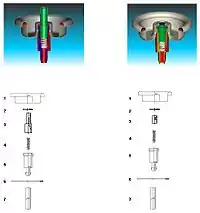 Наиболее общий или, как его обычно называют, стандартный аэрозольный клапан показан на рисунке в двух вариантах «папа» и «мама». Механизм приводится в действие при нажатии на распылительную головку вниз по вертикали. Вниз вместе с головкой двигается шток, прижимая пружину. Отверстие в штоке проходит из-под резиновой прокладки в полость кармана, заполненного продуктом. В это же отверстие подается продукт и через полость штока направляется в головку для распыления. При снятии усилия с головки пружина поднимает шток вверх и действие клапана прекращается.