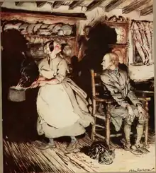 Вечером хозяйка готовит пудинг. Поднимается ветер, и муж просит её закрыть и запереть входную дверь. Та, занятая, отказывается, и они заключают сделку: кто первым заговорит, тот и закроет дверь. Ночью в дом заходят посторонние люди и съедают весь пудинг. Не видя сопротивления со стороны хозяев, они задумывают обесчестить жену и, в двух из трёх вариантов, побрить мужа при помощи ножа. Хозяин не собирается этого терпеть и гневно обращается к ночным визитёрам. Его жена замечает, что тот заговорил первым, и теперь он должен запереть дверь[2].