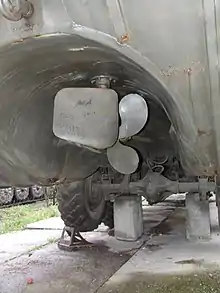 Носовой отсек – это герметизируемое моторное отделение с установленным шестицилиндровым двигателем ЗИС-123 (модель 485) от БТР-152. Двигатель рабочего объёма 5,55 см³ имел мощность 112 л.с., нижнее расположение клапанов, степень сжатия 6,5 и карбюратор типа К-84 падающего потока, с двумя смесительными камерами и ограничитель оборотов на 3100 об/мин. Двигатель мог работать на бензине марки А-70 или Б-70. Для слива масла из картера двигателя были предусмотрены вывинчивающиеся пробки в днище. Носовой отсек сверху прикрывался палубой с двумя люками, фарами, приёмником дополнительного воздухопротока и шкиперским имуществом. Задний люк открывал доступ к моторному отделению, а передний – к системе охлаждения. Для охлаждения двигателя при движении по суше служили воздухопротоки и люк в палубе, через которые воздух поступал в радиатор; на воде — теплообменник, охлаждаемый забортной водой. Три верхние серьги в носовой части служили для буксировки амфибии по суше и воде.