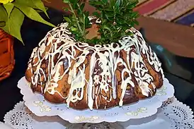 ![]() Пасхальная баба, украшенная веточками зелени | |