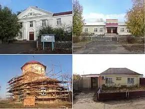 ![]() Слева направо по часовой стрелке: сельский дом культуры, сельская школа, один из магазинов, церковь во время реконструкции | |