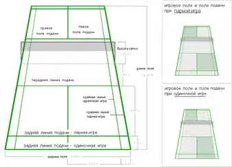 Игра проходит на прямоугольной площадке размером 13,4 на 5,18 метров. Для парной игры используется площадка размером 13,4 (при подаче — 11,88) на 6,10 метров. Высота сетки 1,55 метра у опор, 1,524 метра по центру (провисание); Сетка ограничена сверху лентой шириной в 7,5-8 см, сложенной вдвое, под которой пропускается шнур. Линии шириной 4 см, наносятся на поле яркой (белой или жёлтой) краской и являются неотъемлемой частью того поля, которое они ограничивают (но, например, подавать, находясь на линии запрещено). На расстоянии 1,98 метра от сетки находится линия подачи. Между линией подачи и задней линией находится зона подачи. Центральная линия разделяет зону подачи на правую и левую зоны.
