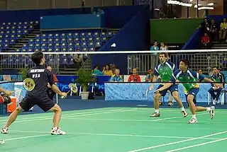 Бадминто́н (англ. badminton, от собств. Badminton) — вид спорта, в котором игроки располагаются на противоположных сторонах разделённой сеткой площадки и перекидывают волан через сетку ударами ракеток, стремясь «приземлить» волан на стороне противника, и наоборот, чтобы он не упал на собственное поле. Соперничают два игрока или две пары игроков (пары могут быть не только одного пола, но и смешанные — мужчина и женщина). Входит в программу летних Олимпийских игр с 1992 года.