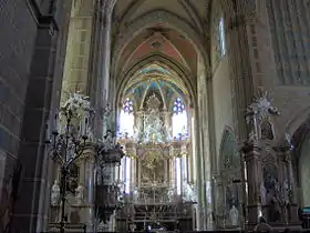 В начале 60-х годов XVIII века в пространствах главного нефа и трансепта были устроены боковые алтари, образы которых были написаны в основном Йосефом Тадеашем Роттером, а рельефные лепные украшения созданы неизвестным автором. Первая пара боковых алтарей: алтарь Девы Марии — Матери Доброго Совета с образом Четырнадцати святых помощников (слева) и алтарь Девы Марии Отрадной с образом Всех святых (справа). Вторая пара боковых алтарей: алтарь Непорочного зачатия с образом Святого Бенедикта (слева) и алтарь Божественного Сердца Господнего с образом Святого Бернара Клервоского (справа). Третья пара алтарей: алтарь Святого Иосифа с образом Святого семейства и образом Марты и Марии (справа) и алтарь Святого Алоизия с образами Святого Альбериха, Святых апостолов Петра и Павла и Святых Прокопа и Яна Непомуцкого (слева)[13].